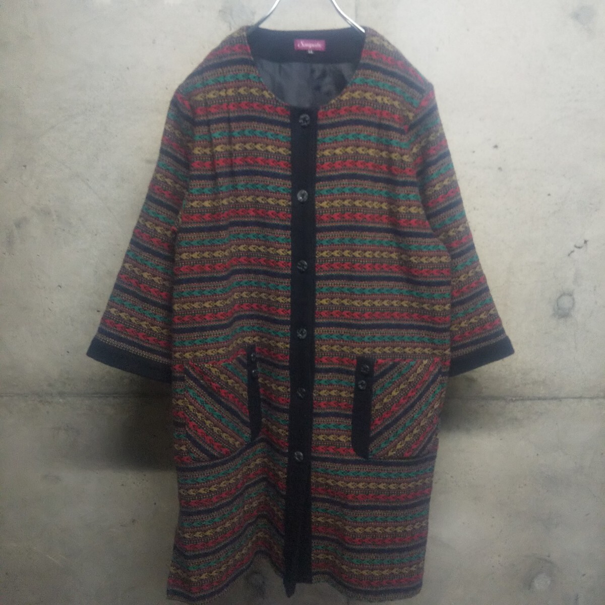 - 昭和レトロ ノーカラーコート ネイティブ柄 LL 七分丈 ウール