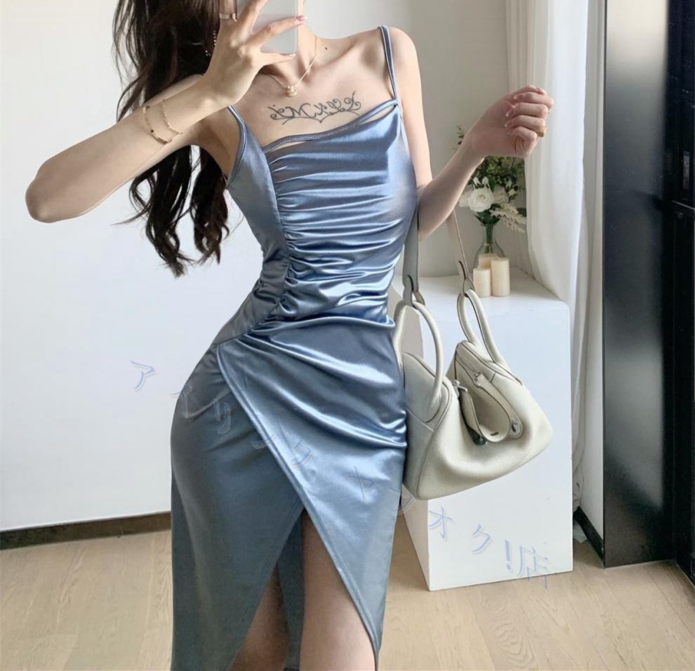 - 新品高級感ある 超絶sexy タイトワンピース レディース ブルー 艶ある 魅惑 無地 ツルツル スリット 透けない ワンピース 男の娘 偽娘 L