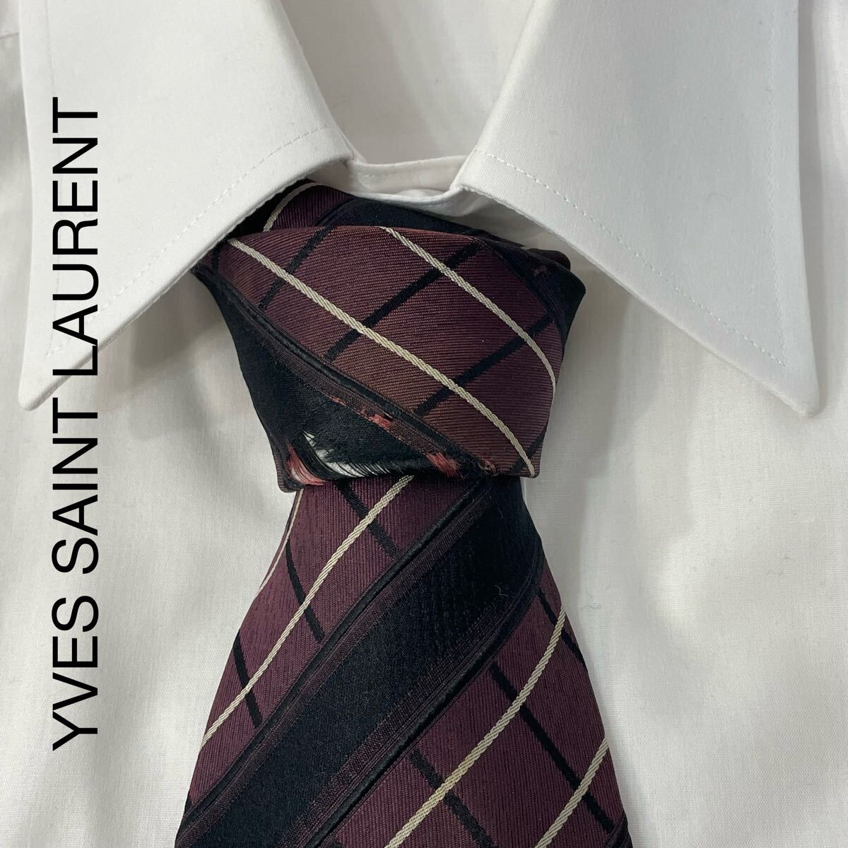- YVES SAINT LAURENT イヴサンローラン チェック ストライプ シルク ネクタイ ワイン ブラック TG531