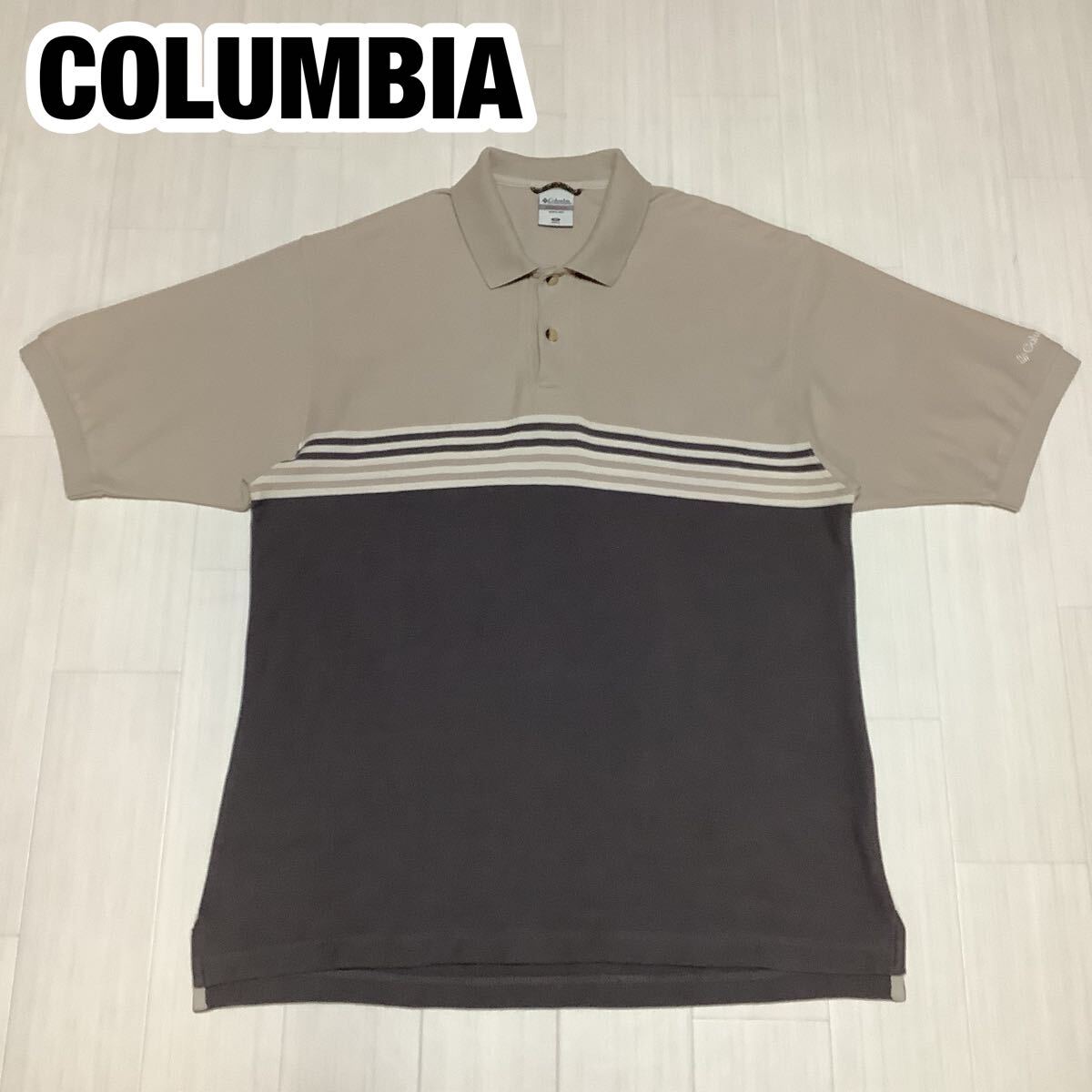 - COLUMBIA コロンビア 半袖ポロシャツ M ボーダー柄 ライトグレー×グレー 刺繍ロゴ