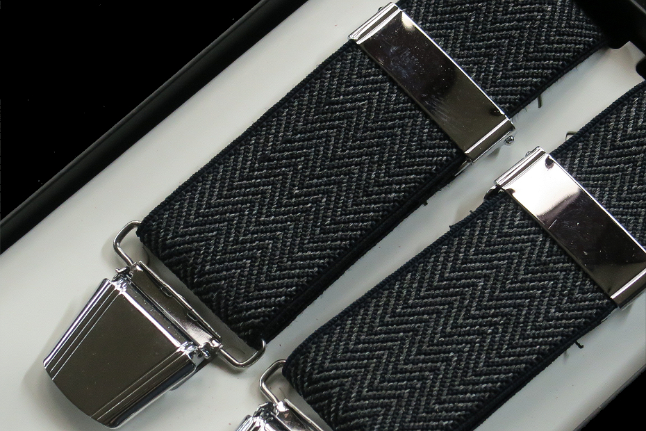 > ◆イギリス U.K SOPHOS ST.GEORGE サスペンダー 35mm X型 シルバークリップ 幅広バックル ブラック杉彩 HERRINGBONE がBRITISHで魅力