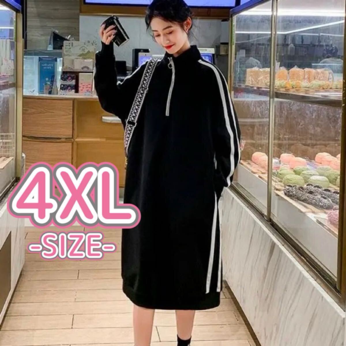 - ひざ丈ワンピース ブラック 4XL 長袖 ハーフジップ サイドライン ゆったり 春秋 オルチャン 韓国ファッション ストリート