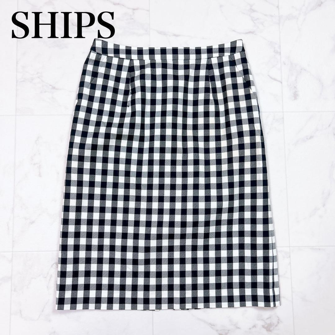 > ■ SHIPS シップス ギンガムチェックスカート 膝丈 タイト 白 ホワイト 紺 ネイビー サイズ 38 M レディース
