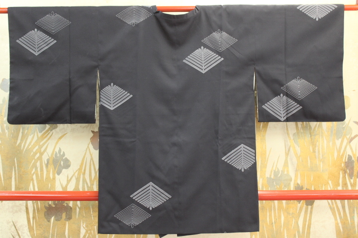 - きもの今昔7909 道行コートコレクション 黒地に若松デザイン柄 正絹先染お召地 コート丈 85cm
