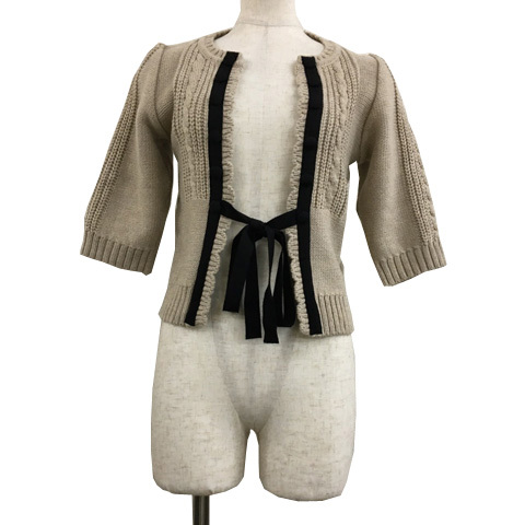 - フローレント FLORENT カーディガン ニット ノーカラー 前開き リボン リブ ケーブル編み 五分袖 ベージュ 黒 ブラック レディース