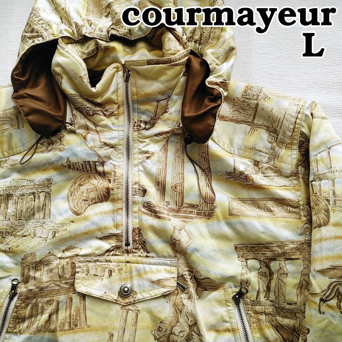 - courmayeur クールマイヨール スキーウエア ヴィンテージ ゴールド ローマ柄 L フード着脱 クールマイユール 241119t-01