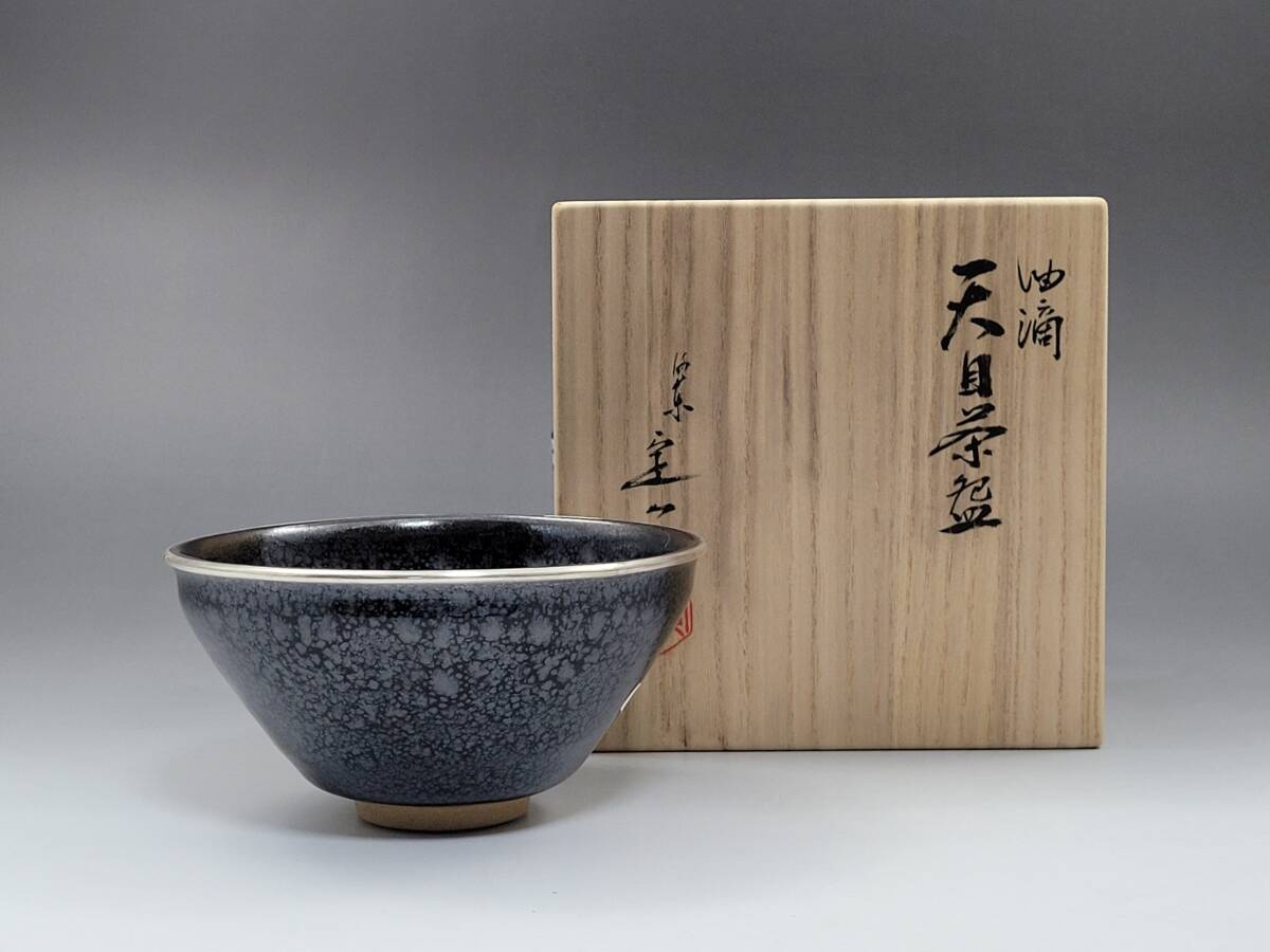 > ● 幅 約 13.1cm 雪が積もったような銀色の窯変が美しい 桶谷定一作 油滴 建盞 天目茶碗・盃 小碗 杯 盞 小鉢 茶道具 煎茶道具 酒器 ●