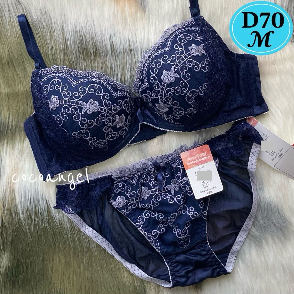 > 【D70-Mネイビー 上下セット】新品 ブラ&ショーツ ブラジャーショーツセット パッド内蔵 薔薇刺しゅう バラ かわいいブラ 寄せ上げ Dカップ