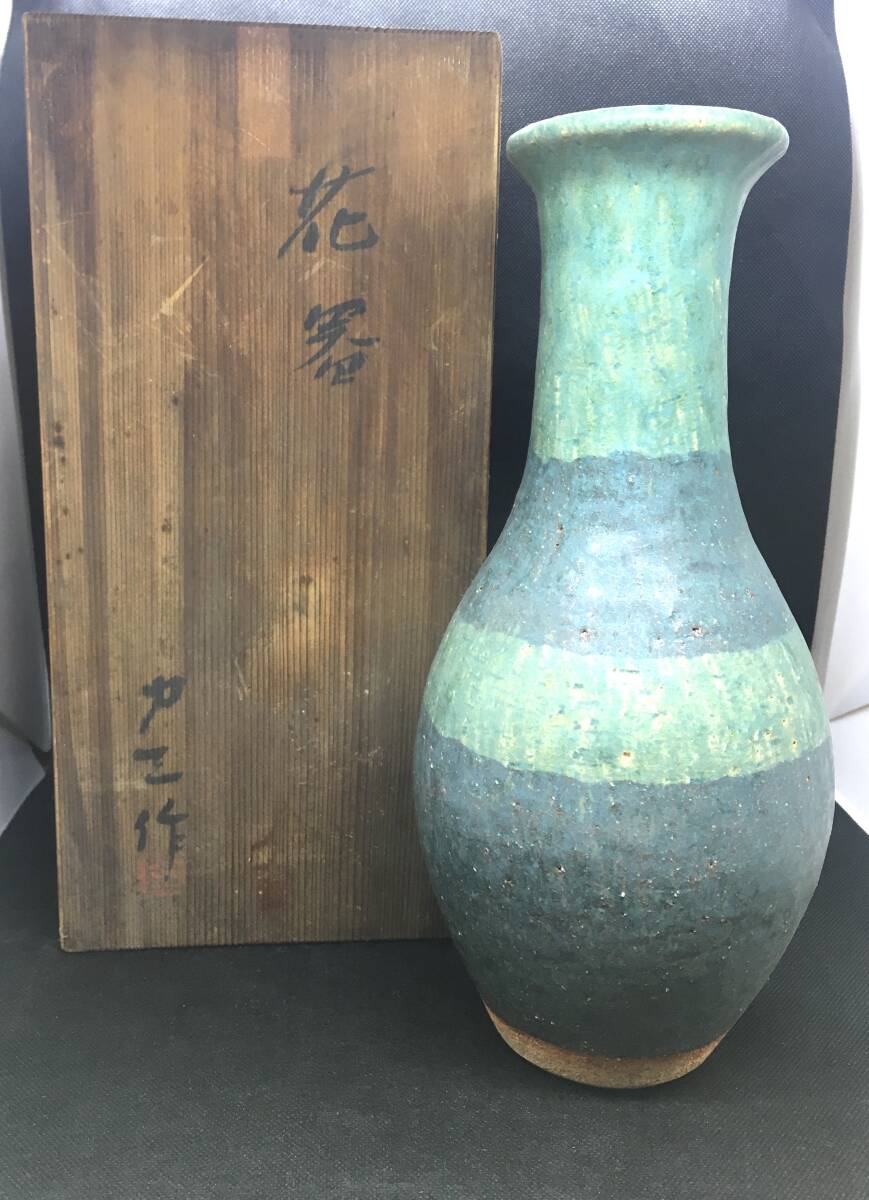 - 【未使用保管品】上川力三作 花器 花瓶 華道具 緑 共箱