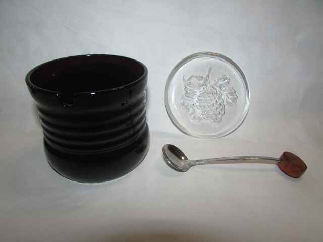 - 即決商品( 旧家・蔵出し )昭和レトロ( 古い味わいのあるガラスの砂糖入れ・濃い紫色ガラス・イチゴ模様の蓋 ) 普段使いに