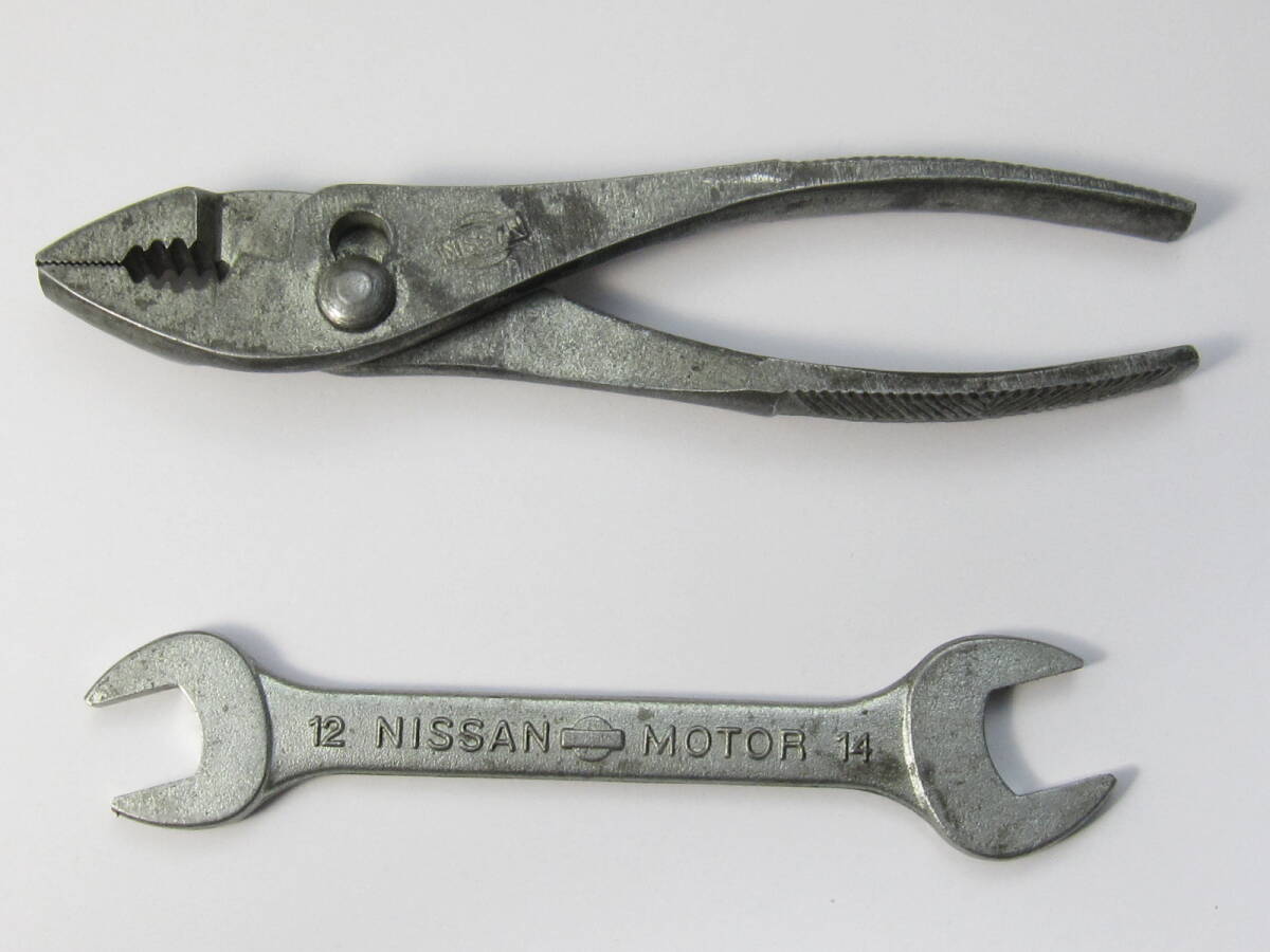 > クリックポスト送料無料!! 日産 ニッサン NISSAN プライヤー 両口スパナ 12×14 ペンチ 純正 車載工具 KTC ? 旧車 当時物 中古 傷錆多数