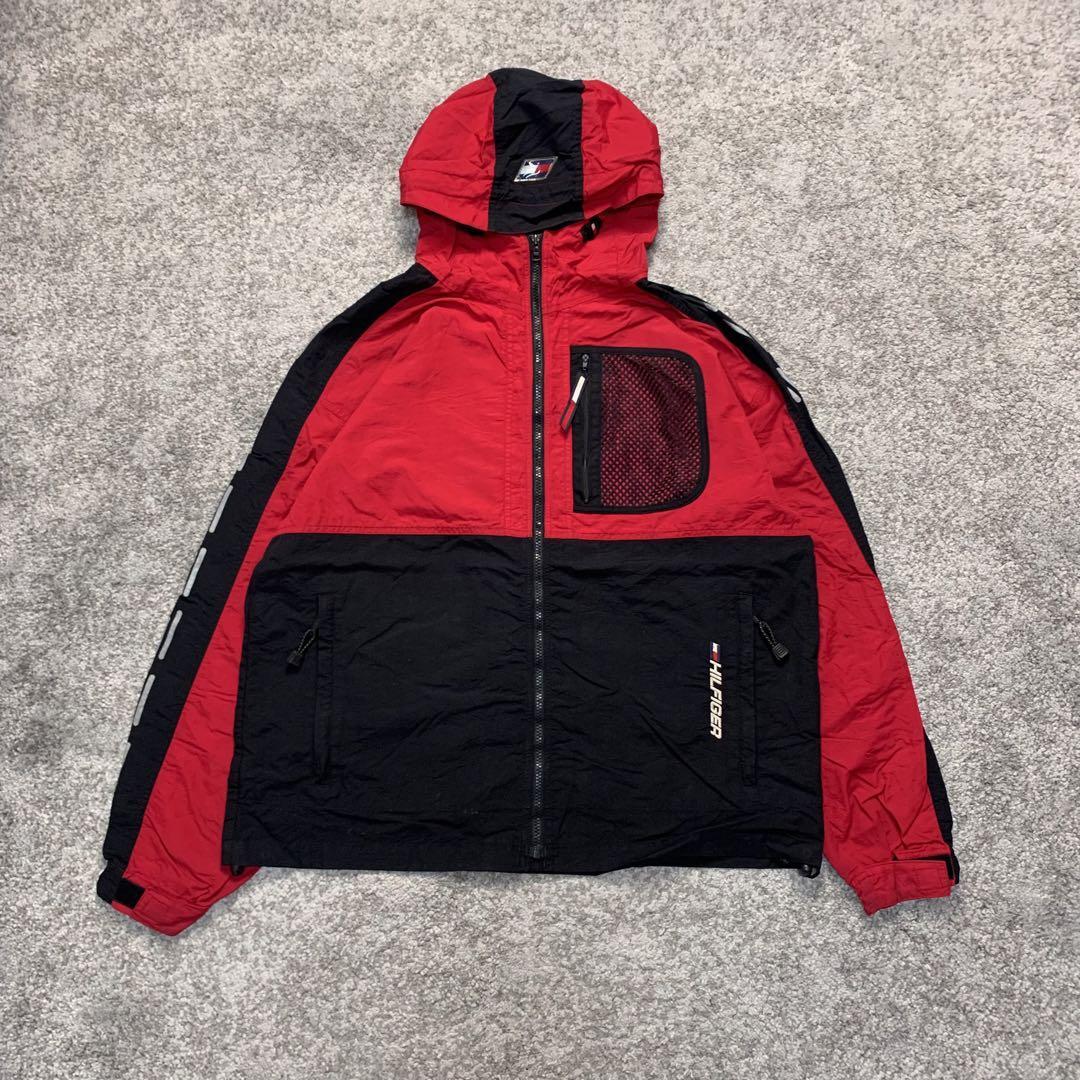 - L相当 トミーヒルフィガー ナイロンジャケット フード付き 刺繍ロゴ 赤色 黒