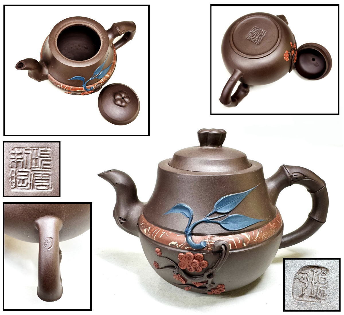 - 【送料無料】中国宜興 紫砂 刻梅花茶壺 在銘刻印あり 唐物 美術 骨董品 煎茶道具 朱泥 急須 (旧家蔵出し) WWTT286