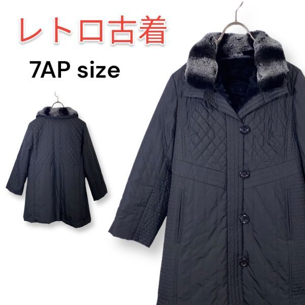- 高級 襟ファー付き キルティング ハーフコート 黒 ブラック 7APサイズ ポリエステル レッキスファー ラビットファーライナーベスト