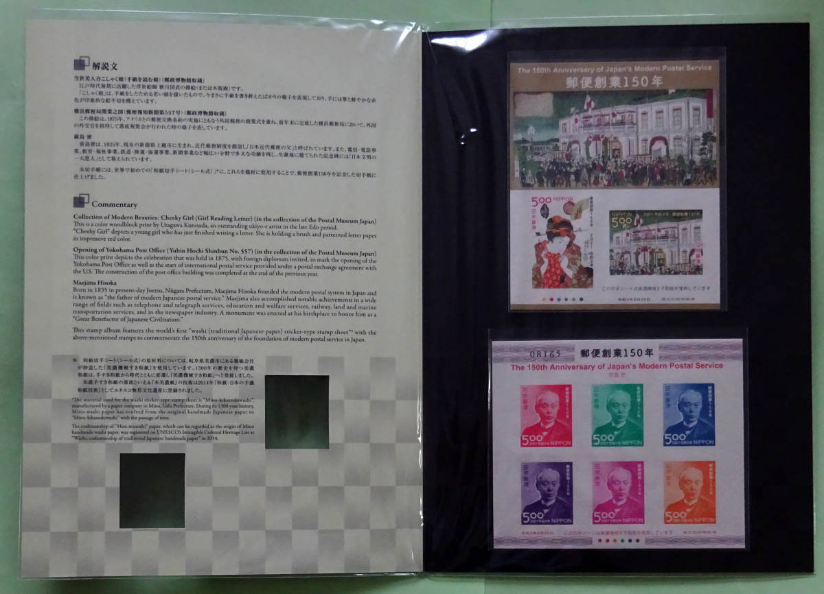 ●郵便創業150年 特別版 切手シート(2021年8月発行)、商品重量:約108 g 、商品の大きさ:約305×211 mm、梱包後重量:150~200グラム/辛くも1cm以内、郵便局売価5000円
