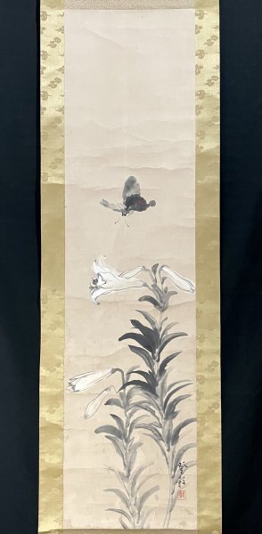 - SM3912[真作]吉田登毅「蝶百合図」掛軸 紙本 花鳥図/蝶 百合 日本画 絵画 日本美術 松林桂月に師事 千葉の人