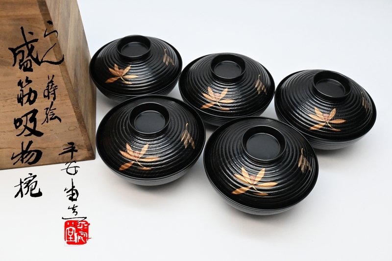 - 吸物椀 平安堂造り ■ らん蒔絵 盛筋吸物椀 [欄] 蓋裏蒔絵 5客■ 茶道具 天然木 懐石 料亭 懐石 小料理 共箱入■