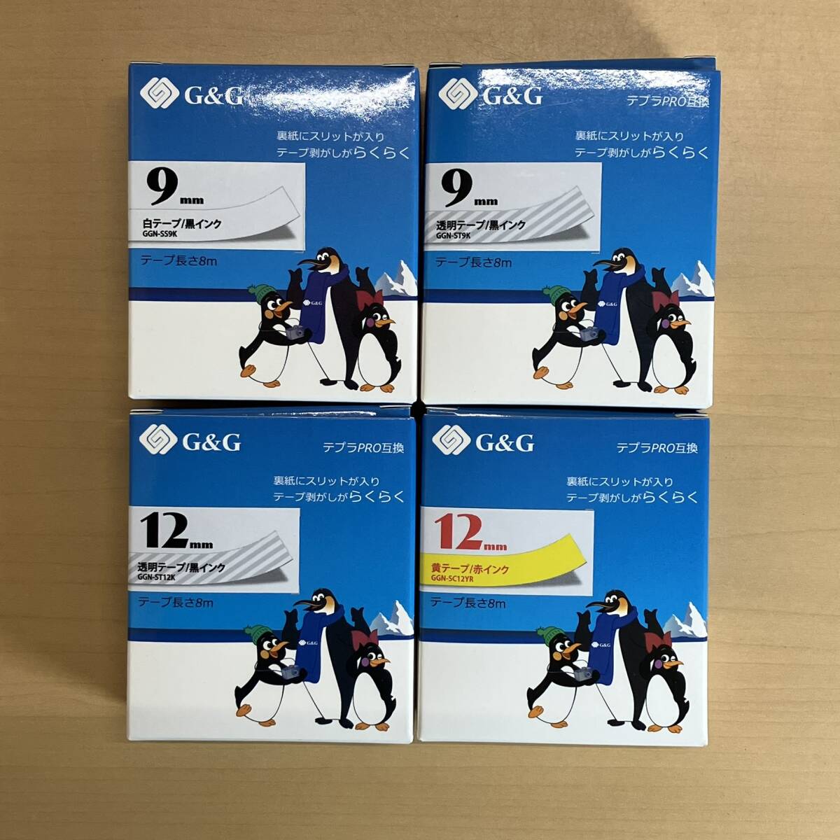 > テプラPRO互換テープ4本セット(G&G 白テープ/黒インク9mm・透明テープ/黒インク9mm・透明テープ/黒インク12mm・黄テープ/赤インク12mm)