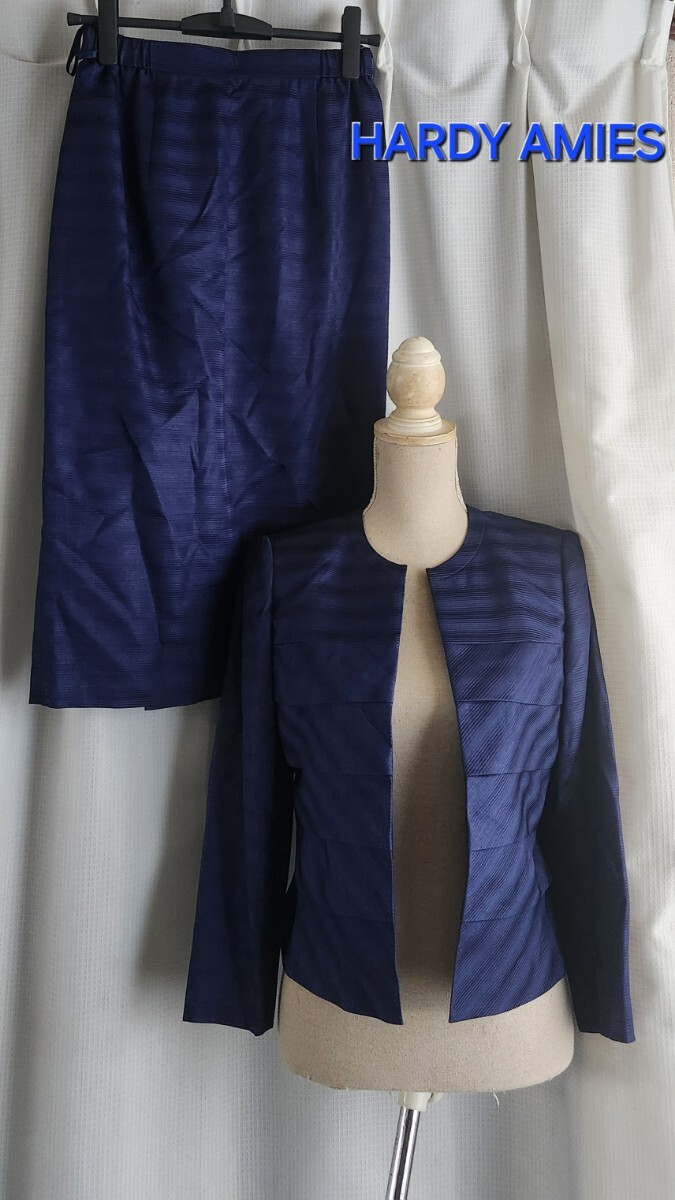 - 美品 保管シワ HARDY AMIES BLACK LABEL 綺麗なパープルブルーのスーツ ノーカラージャケット すか スカート