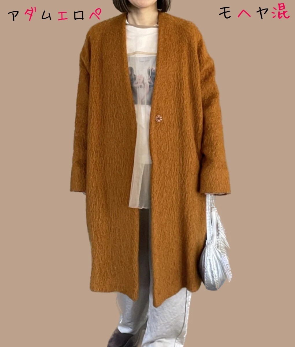 - アダムエロペ ノーカラーロングコート モヘヤ混 シャギーコート 茶 ブラウン