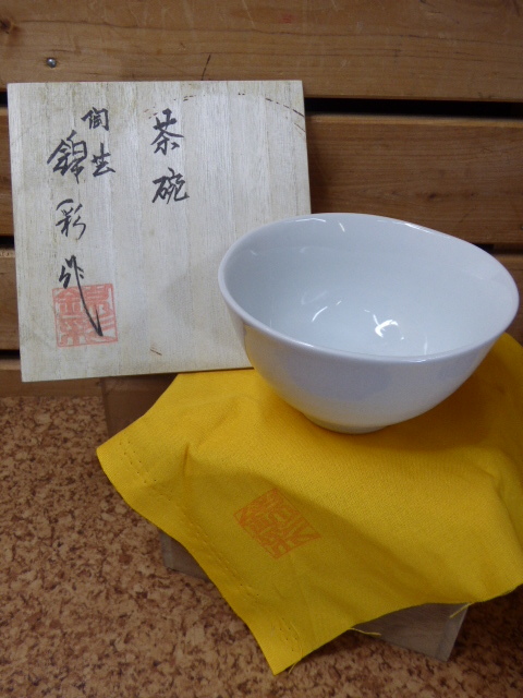 - ほ268.茶碗 陶芸 錦彩作 白磁 シンプル 共箱入り Φ11.5cm