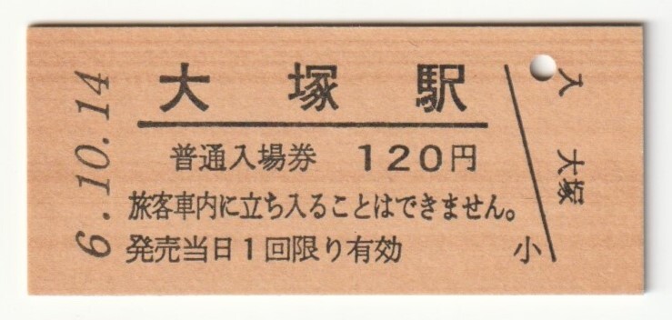 - 平成6年10月14日 山手線 大塚駅 120円硬券普通入場券(日付印刷)