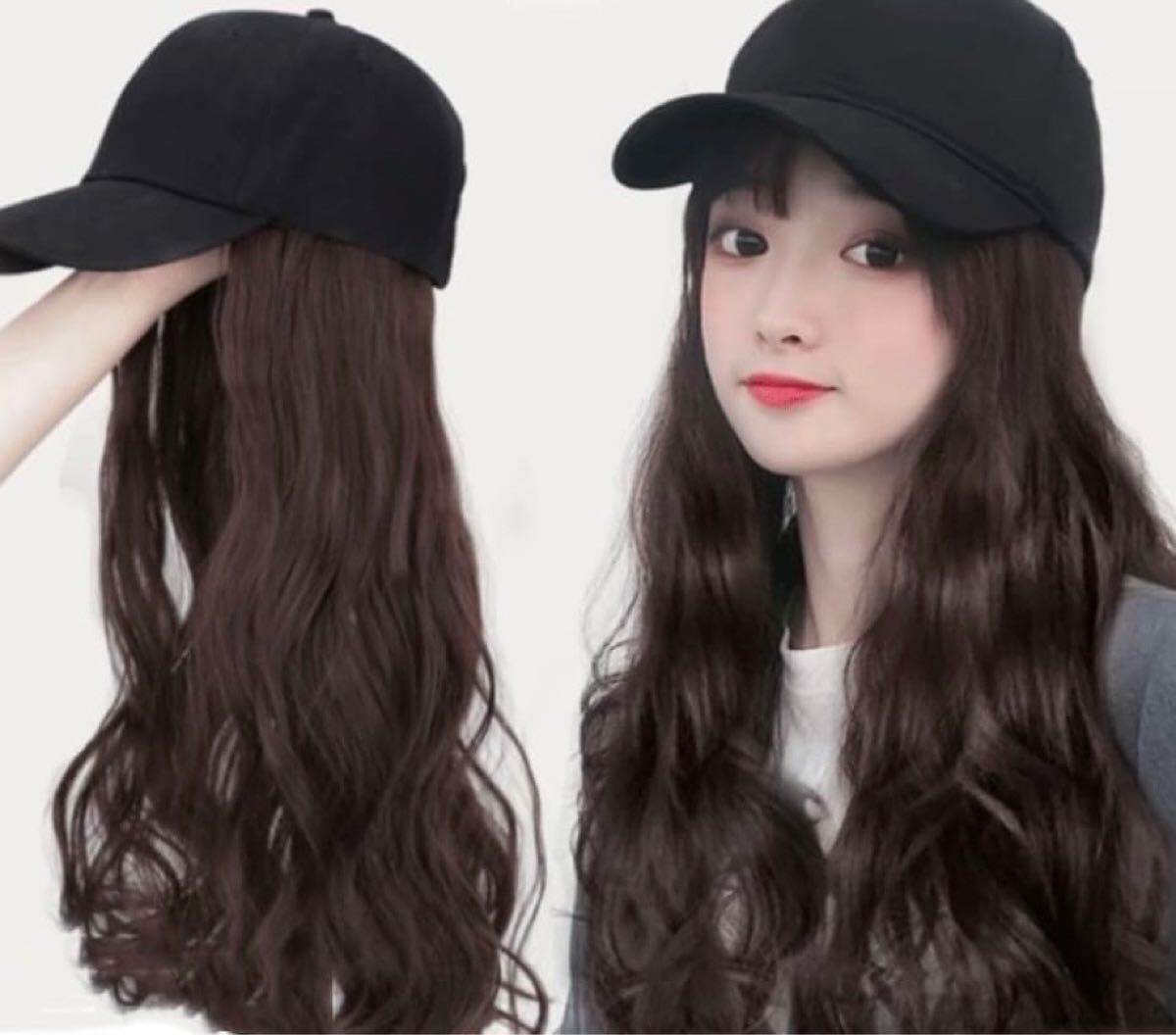 - W32◎帽子ウィッグ ファッションウィッグ ロング カール ブラックブラウン かつら