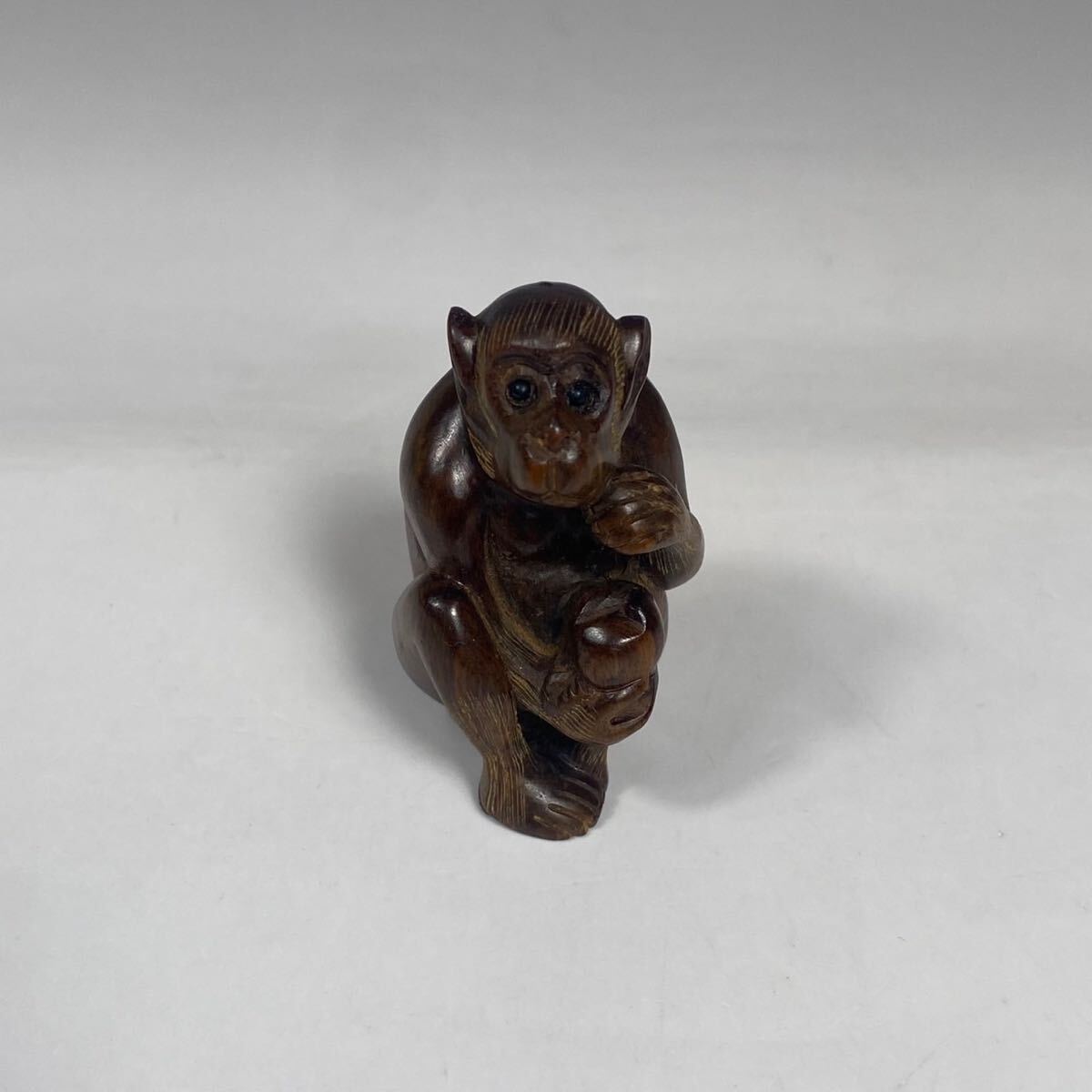 - 根付 提げ物 在銘 猿 彫刻 ガラス目 美術品 作家物 唐木 果物を食べる猿