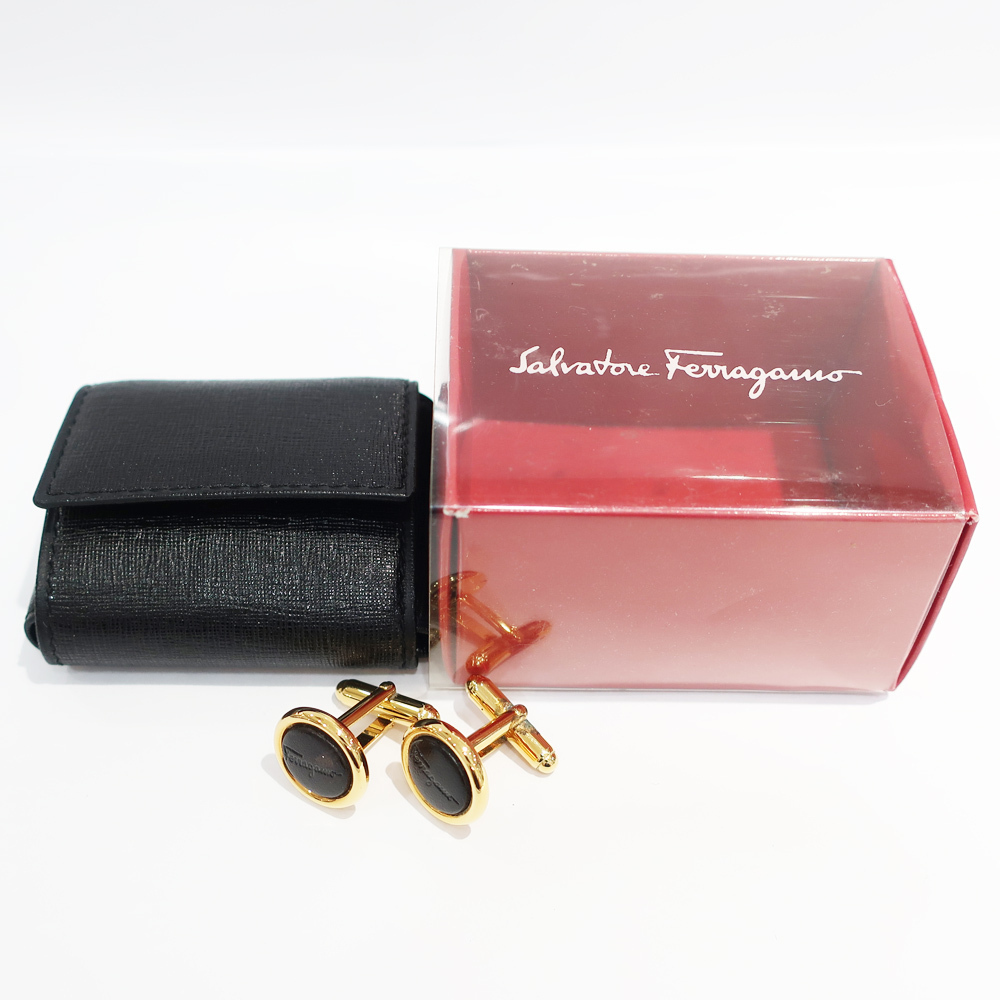 > $ 極美品 $ 訳あり 箱付き● ブランド カフス ● Salvatore Ferragamo ◆ フェラガモ ◆ 本革レザー製 ロゴ刻印 モチーフ◆ 黒× ゴールド