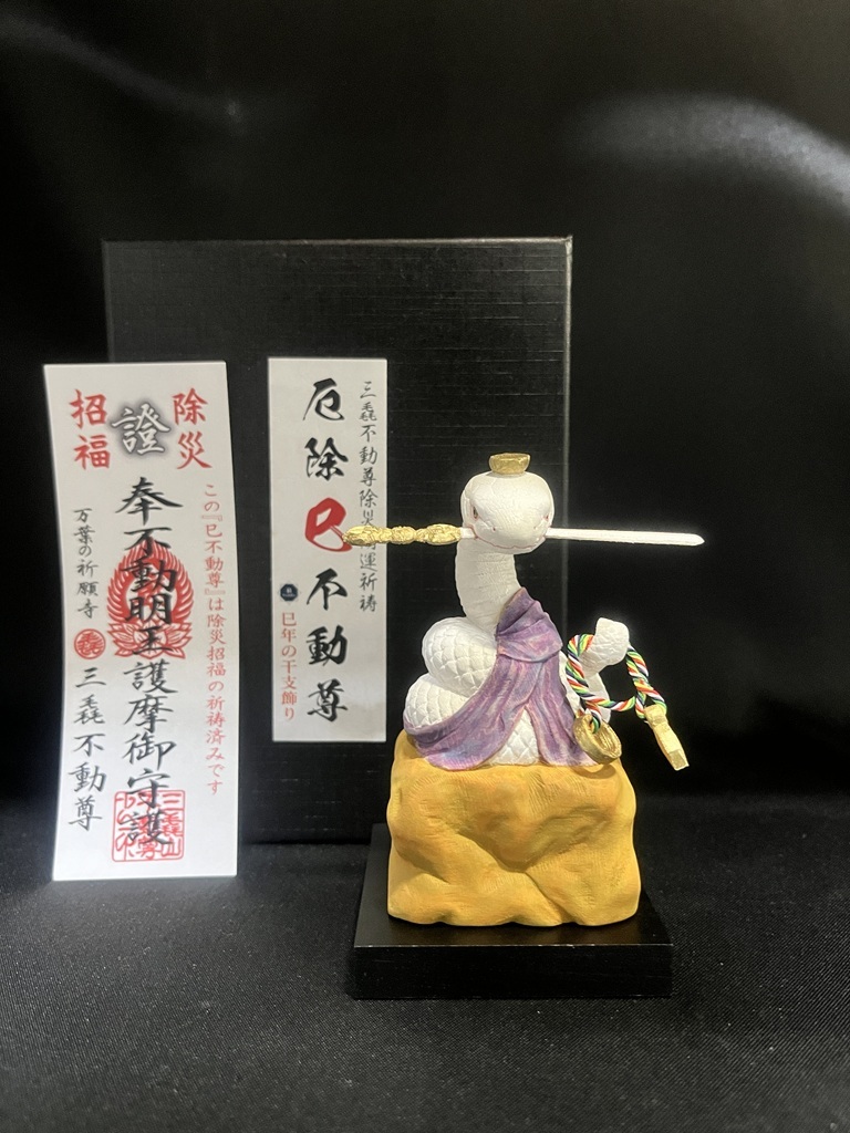 - 「2025年 厄除/開運/巳不動尊/三毳不動尊御祈祷済み/桧製/台座付」仏師 酒井豪作/高さ9.3cm/猫 buddha 干支飾り/川本仏壇店/川本仏