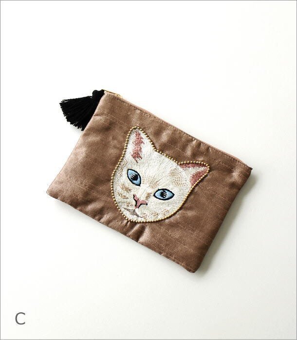 - ポーチ 小物入れ 猫 ねこ おしゃれ 刺繍 丸 フラット 小物入れ キャット刺繍ポーチ A 【Cタイプ】 送料無料(一部地域除く) kan9847c