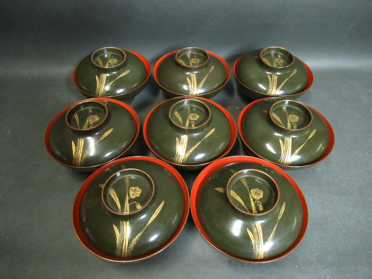 - 【広吉堂】輪島塗 吸物椀 蒔絵 木製 緑 時代物 美品 8客(KL)