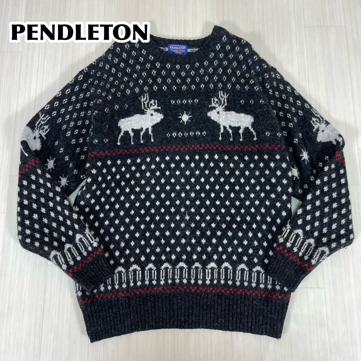 > ☆入手困難☆ペンドルトン トナカイ アニマル バーズアイ ノルディック 総柄 ジャガード ウールニット セーター ダークグレー L 古着