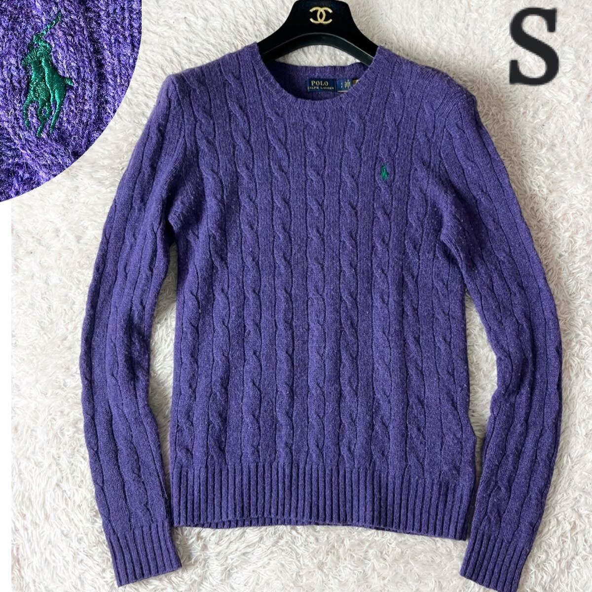> POLO Ralph Lauren ポロラルフローレン カシミヤ カシミア ウール ケーブルニット セーター ポニー ワンポイント刺繍 丸首 紫 パープル S