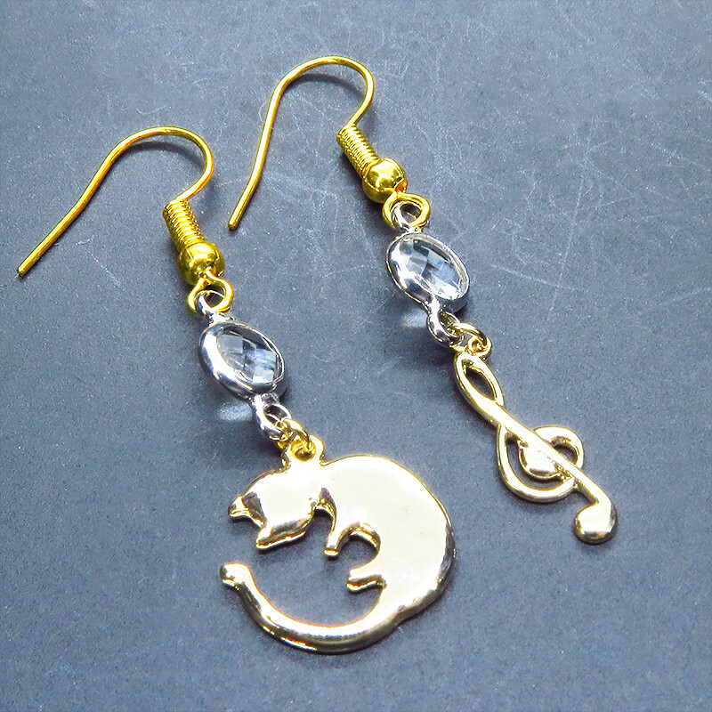 - ゴールドカラー 丸くなってる可愛い猫と音符のアシンメトリーピアス ラインストーン サージカル可