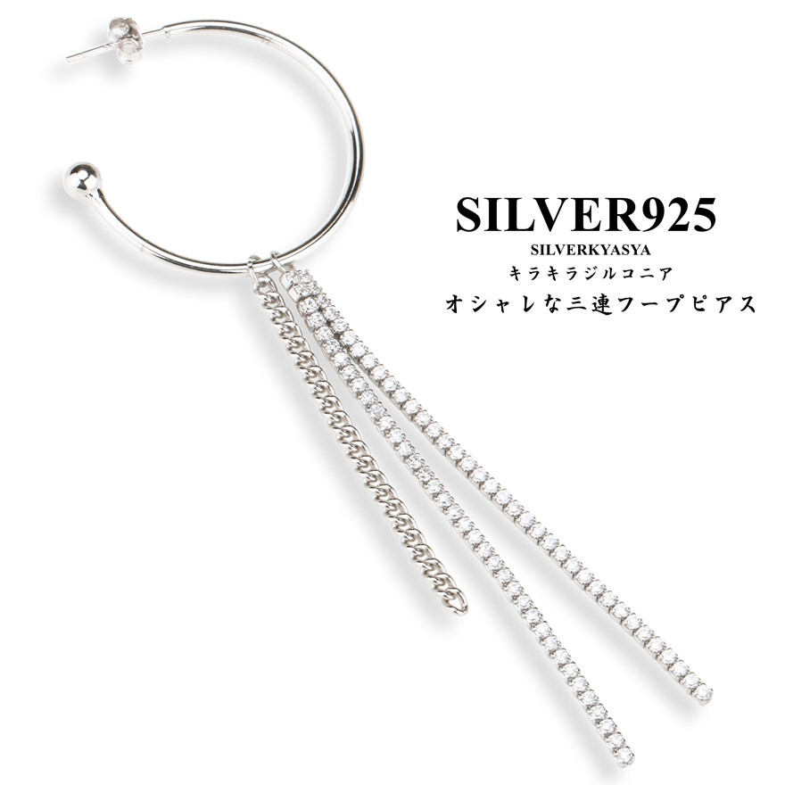 - シルバー925 ジルコニア フープピアス パブェ CZ 三連 チェーンピアス キラキラ お洒落 人気 片耳