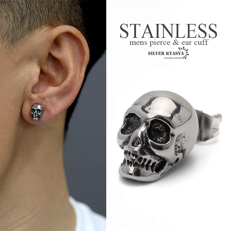 - スカルピアス ステンレス メンズ スタッドピアス シルバー 骸骨 ドクロ 燻し風加工 金属アレルギー対応 片耳 1点