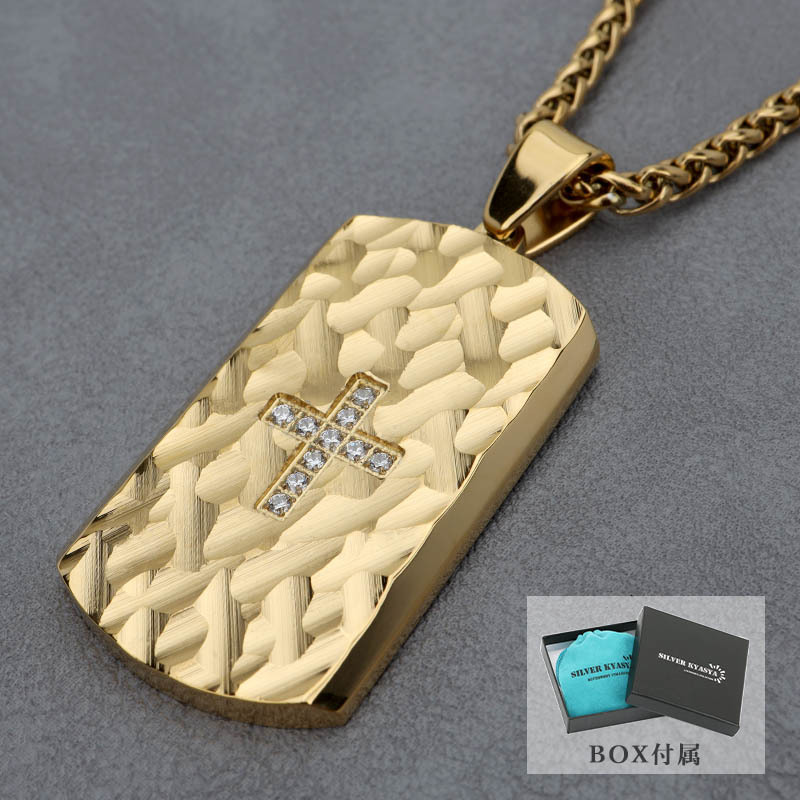 > 無骨 存在感 シンプル メンズネックレス プレート ゴールド 金 ドッグタグネックレス ストーン付き チェーン付き 専用BOX付属