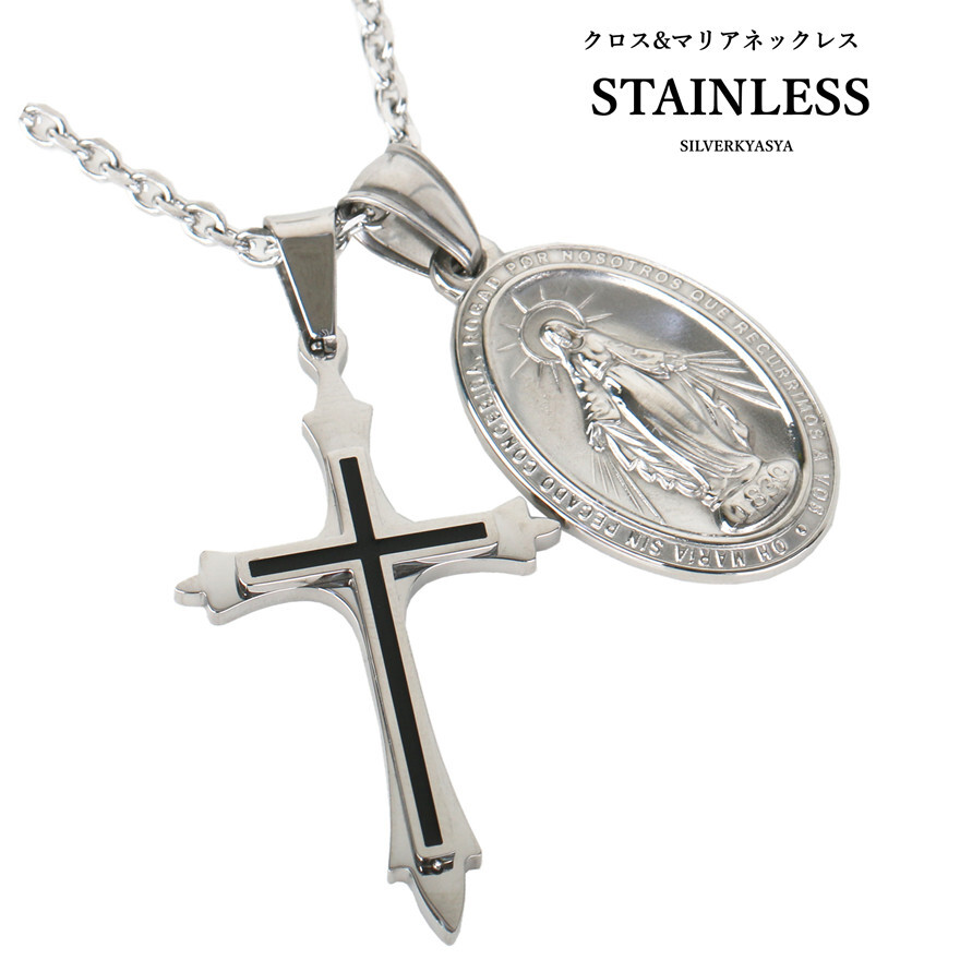 - 高品質ステンレス素材 クロス マリア ネックレス 十字架 ペンダント 奇跡のメダイ クロスネックレス あずきチェーン50cm