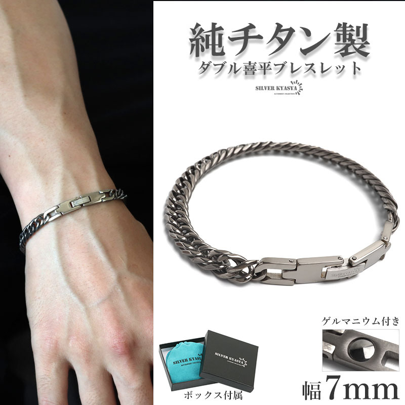 - 純チタン製 軽い ダブル喜平チェーンブレスレット 幅7mm シルバー ゲルマニウム 金アレ対応 専用BOX付属