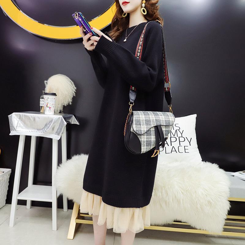 - 【ブラック色・Lサイズ】ニット ワンピース ひざ丈 韓国