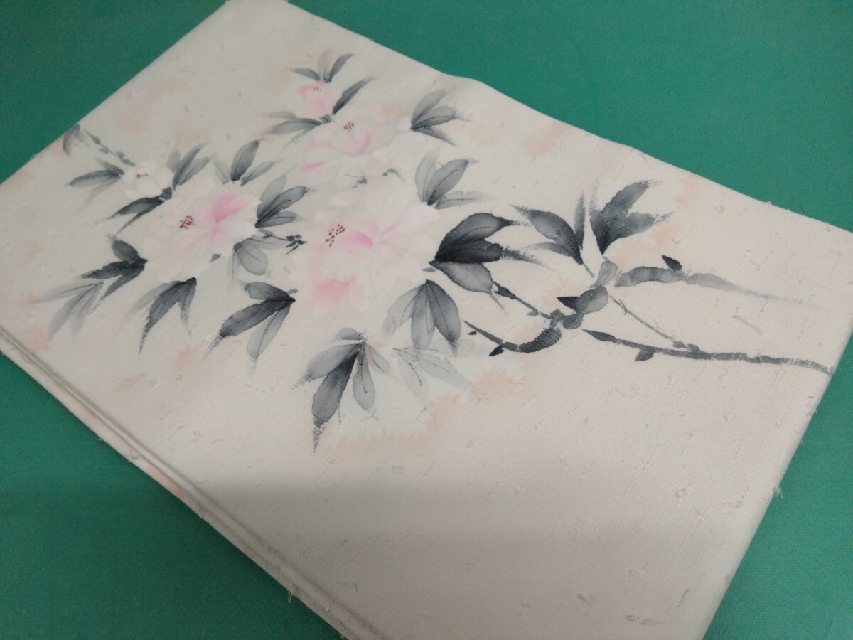 - ●30 ひげ紬 大ぶり 牡丹 墨絵 和モダン オシャレ 可愛い 名古屋帯 おそらく 未使用品 ④