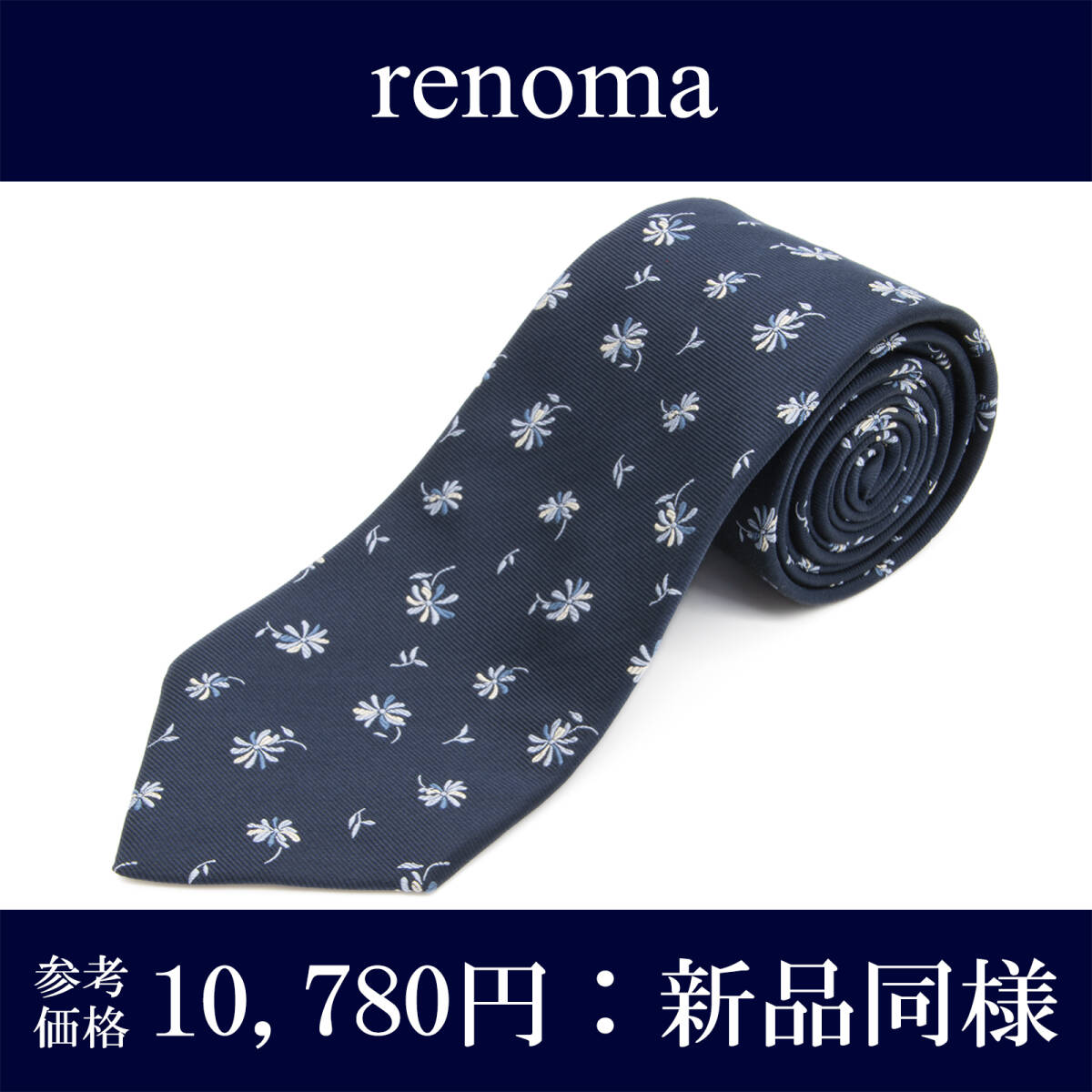 > 送料無料 レノマ ネクタイ 新品同様 ジャガードタイ シルク ネイビーブルー 水色 白 ホワイト ブランド 総柄 花 珍しい おしゃれ 綺麗 N321