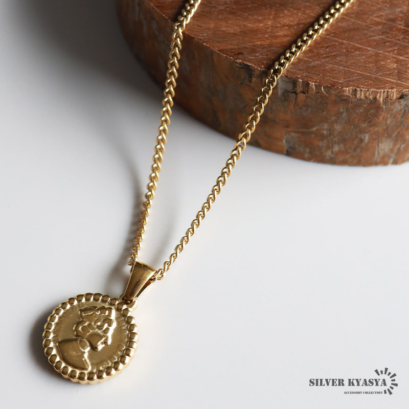 > (60cm) コインネックレス 喜平チェーン アンティーク エリザベス女王 ゴールド 18K ステンレス 金属アレルギー対応
