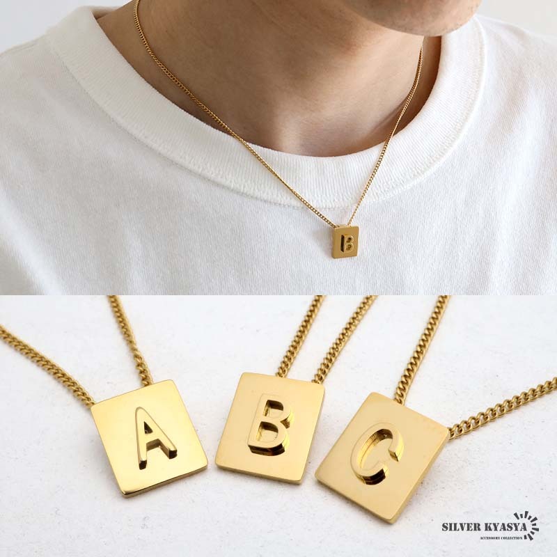 - (S) イニシャルネックレス ゴールド スクエア プレート ステンレス 18KGP 鏡面仕上げ 喜平チェーン 金属アレルギー対応