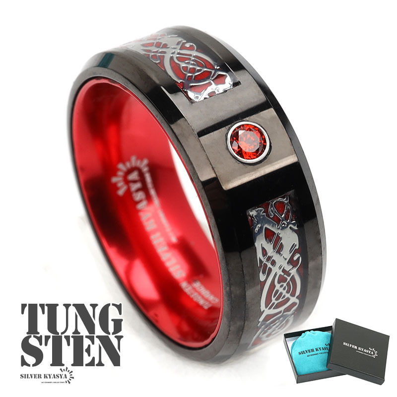 - (9号) タングステン リング 指輪 ブラック ドラゴンライン レッド 一粒 ストーン 男性 リング 専用BOX付属