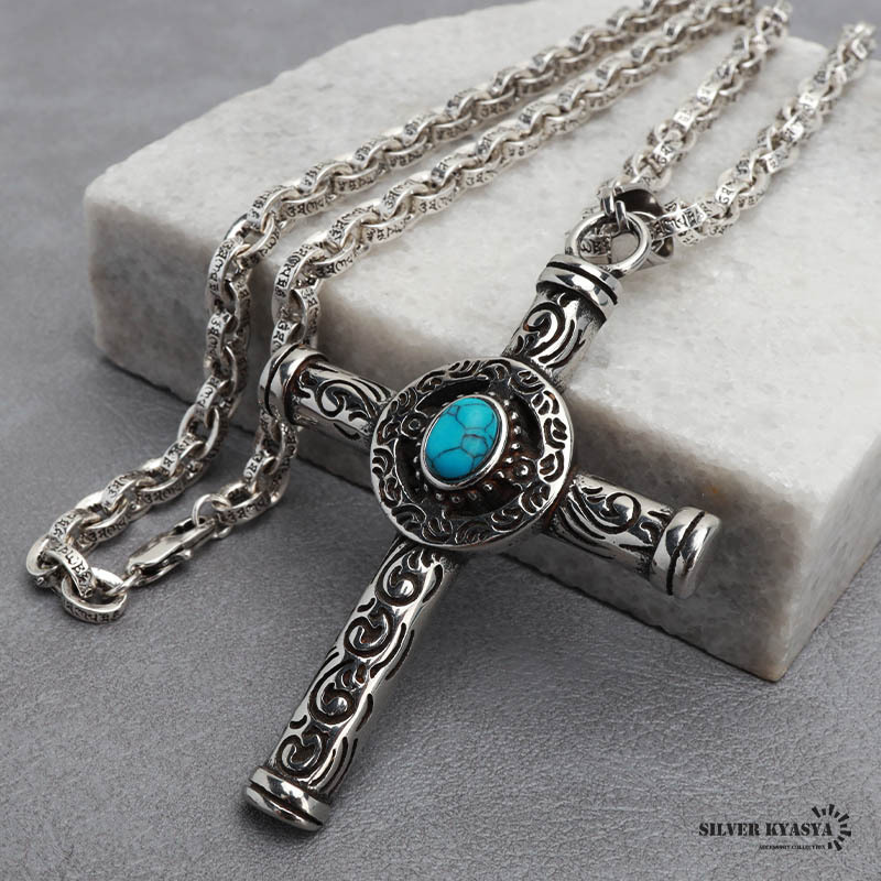 - (60cm) ステンレス 唐草クロスネックレス ペーパーチェーンネックレス 六字真言ネックレス シルバー ターコイズストーン