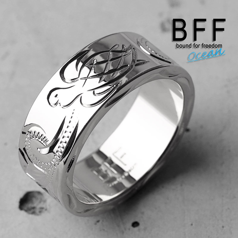 - (14号) BFF ブランド タートル 幅8mm 平打リング シルバー 銀色 ウミガメ ペア 手彫り 専用BOX付属