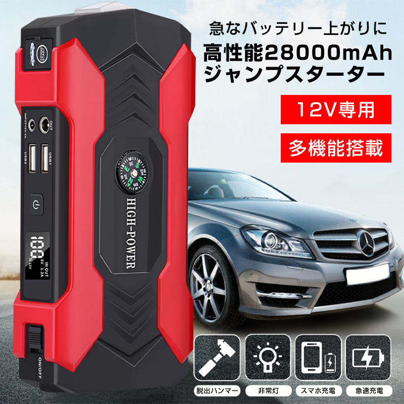 > ジャンプスターター 12V バイク 車専用 28000mAh 大容量 バッテリー上がり 即解決 多機能 脱出ハンマー 緊急ライト コンパス 持ち運び