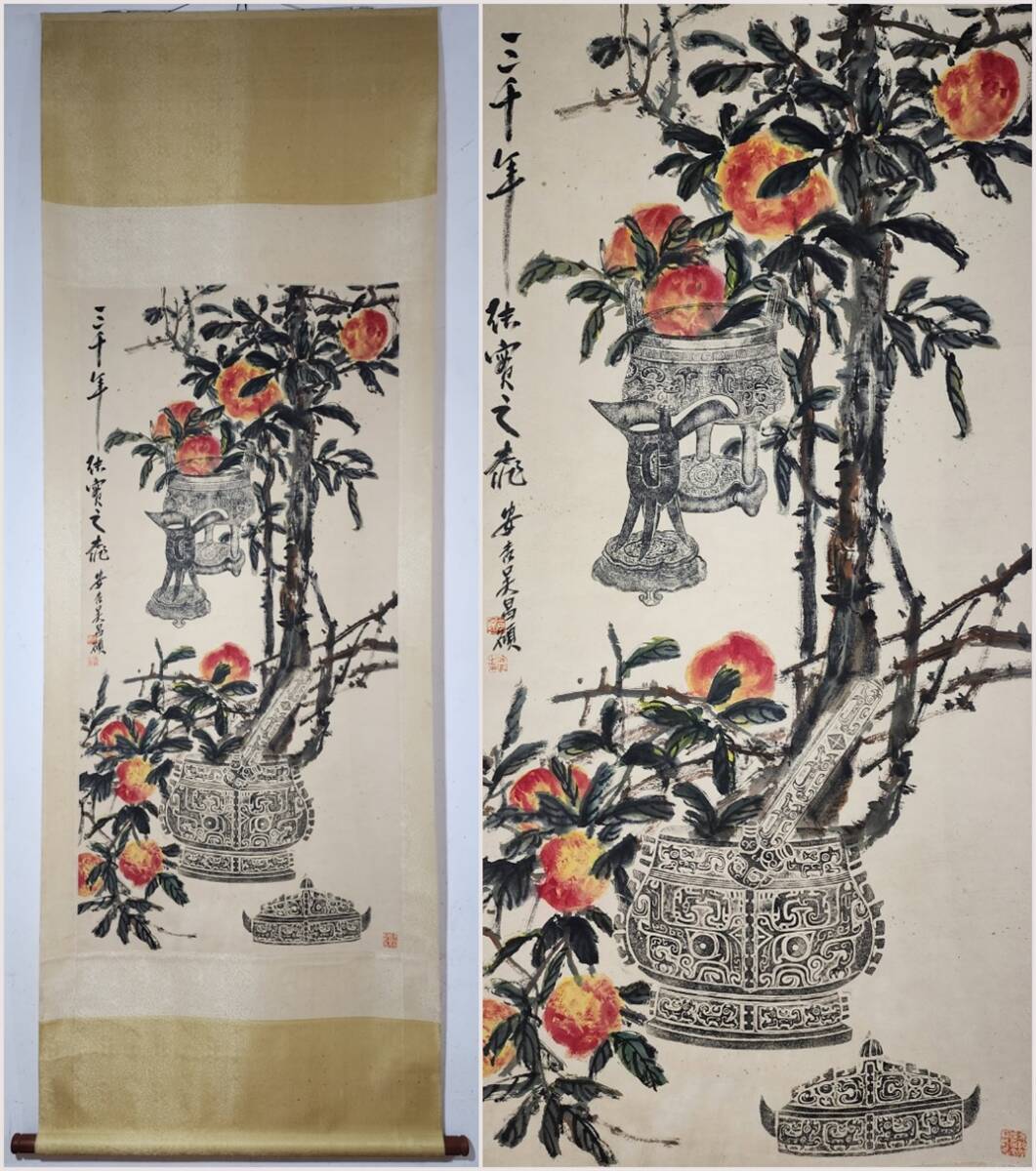 - 古美術 掛け軸 中国・近現代 「呉昌碩書」 紙本 【博古壽桃図】 立軸 書道 巻き物 真筆逸品 肉筆保証 唐物 古画 LT-24875